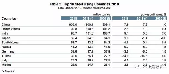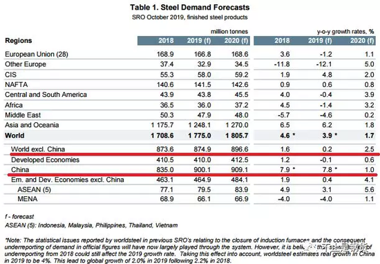 其中中国钢铁需求2019年增长7.8%、2020年增长1%;世界除中国外钢铁需求2019年增长0.2%、2020年增长2.5%。