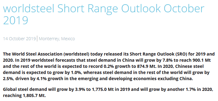 WSA预计,今年中国的需求将增长7.8%,与2018年的7.9%基本持平,但明年增速将骤降至1%,仍然高于4月时的预测。当时WSA预计,随着经济刺激措施的效应消退,中国钢铁需求将在2020年小幅缩减。