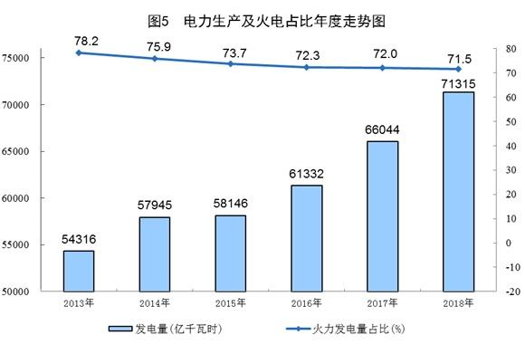 火电比重下降。2018年,火力发电量50963亿千瓦时,比2013年增长20.0%,远低于清洁能源发电71.8%的增速。火力发电占比71.5%,比2013年下降6.7个百分点,电力生产清洁低碳化趋势明显。分地区看,山东、江苏、内蒙古和广东火力发电量分列前四位,2018年分别为5525、4578、4164和3468亿千瓦时,合计占全国的34.8%。