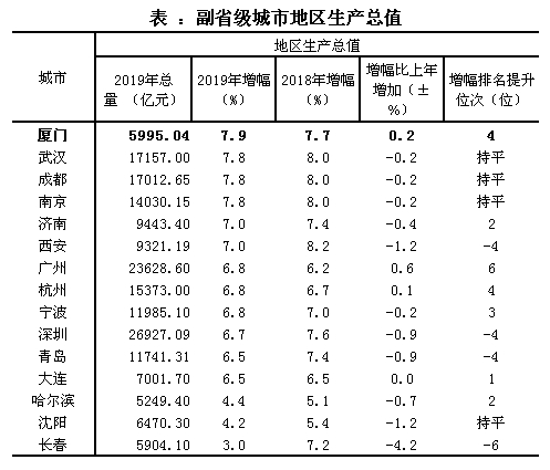 根据厦门市统计局官网日前发布的《2019年厦门与副省级城市比较分析》(下称“分析报告”),2019年,15个副省级城市中,GDP超过万亿元的为8个。