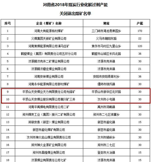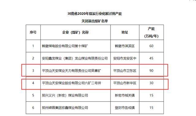2020年,河南化解过剩产能小组发布河南关闭退出煤矿名单公示,其中有两家为 平顶山煤矿。