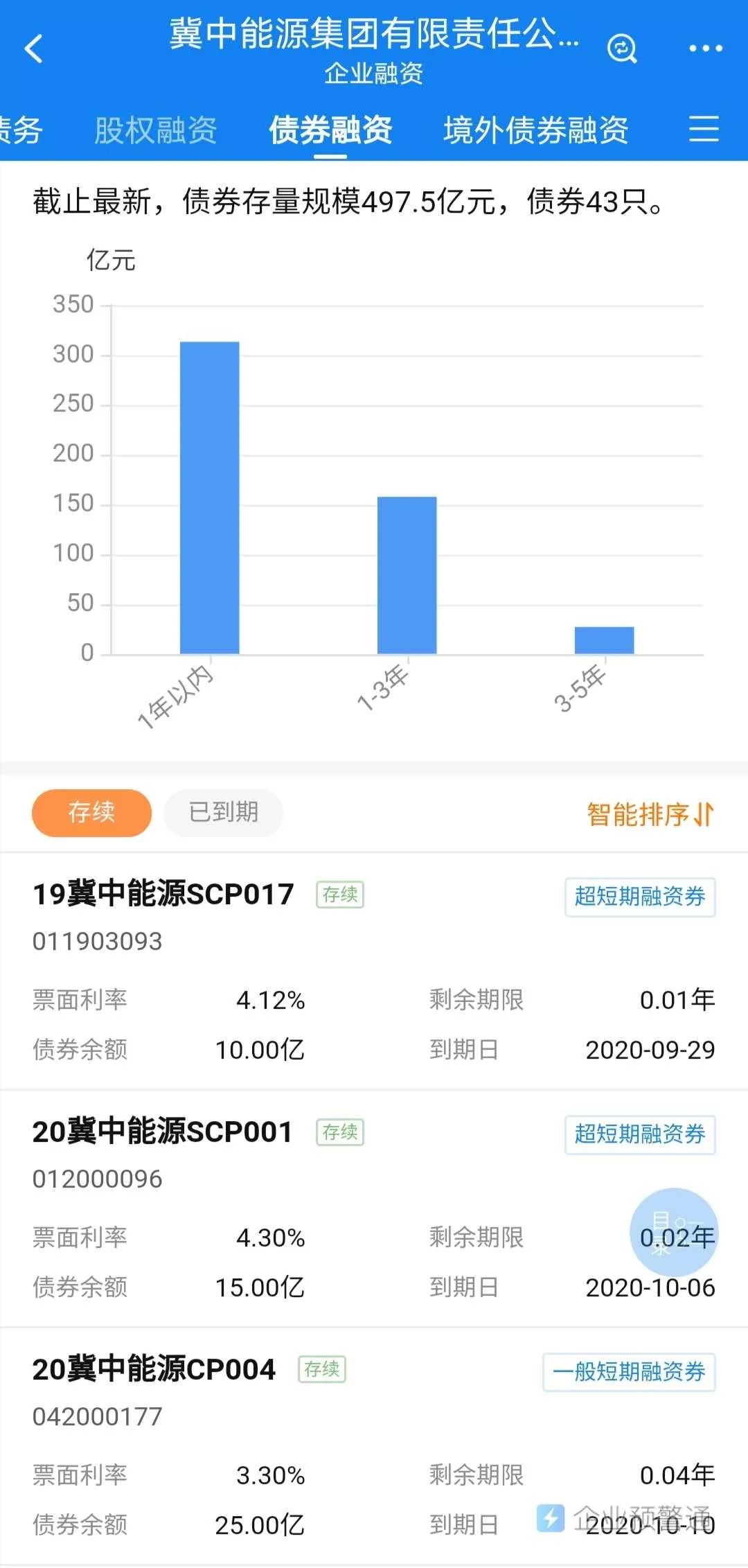 企业预警通显示,截至最新,集中能源集团债券存量为43只,规模总计为497.5亿元。其中一年内到期的债券规模超过300亿元。