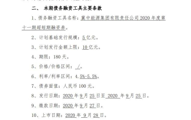 公开信息显示,该债券原簿记建档时间为9月25日9:00至17:00。9月25日,冀中能源集团发布公告称,延长簿记建档结束时间至9月27日10:00。