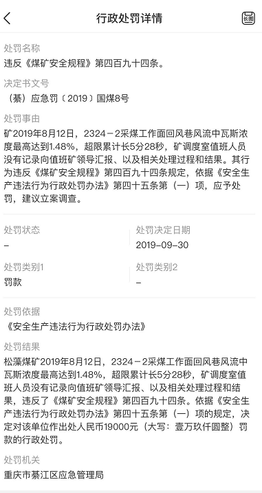 2019年12月,松藻煤矿因矿井下未定期测定预抽瓦斯钻孔孔口负压,违反了《防治煤与瓦斯突出细则》(煤安监技装〔2019〕28号)规定定期测定预抽瓦斯钻孔孔口负压的规定,被警告和罚款1.9万元。