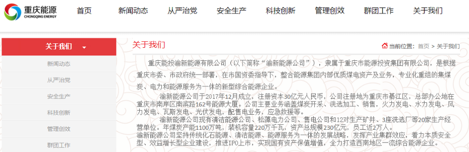 重庆能投渝新能源有限公司官网显示,公司成立于2017年12月28日,注册资本30亿元人民币,业务涉及煤炭开采、洗选加工、销售,火力发电、水力发电、风力发电、瓦斯发电、光伏发电,配售电业务,应急救援等,年煤炭产能1100万吨,装机容量220万千瓦,资产总规模230亿元,员工近2万人,是一家集煤炭、电力和能源服务为一体的新型综合能源企业。