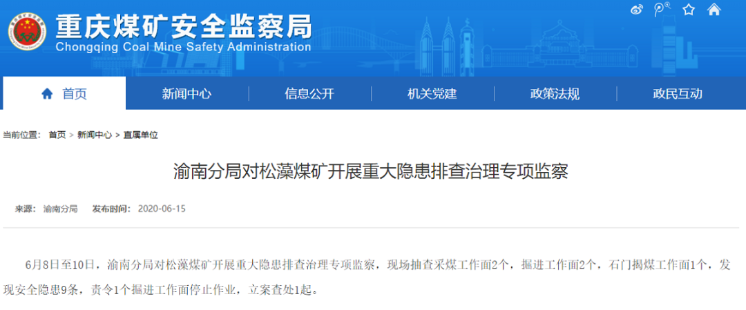 今年4月18日,因松藻煤矿未对3222S采面液压支架间采空区侧进行灌浆的事实违反了《煤矿安全规程》(国家安全生产监督管理总局令第87号)第八条第三款,被警告和罚款2.9万元。