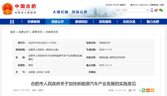 合肥市人民政府发布关于加快新能源汽车产业发展的实施意见,到2025年,新能源汽车产业规模超过千亿,整车产能达到100万辆。