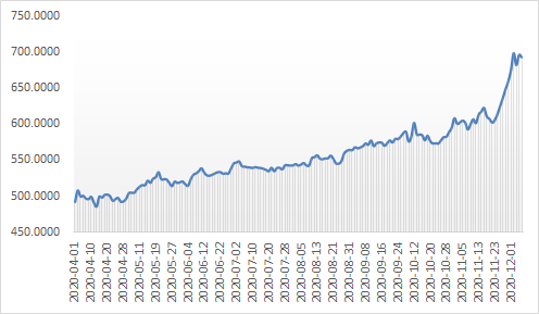 远期市场看涨情绪也持续走强。动力煤2101合约连续强势拉涨,从11月23日的605.8元/吨到12月7日的693.6元/吨,上涨近90元,涨幅14.5%。该合约最高曾达到699.2元/吨的水平。A股煤炭板块行情也随之启动,郑州煤电等多只煤炭股连续飘红,7日宝泰隆涨停。