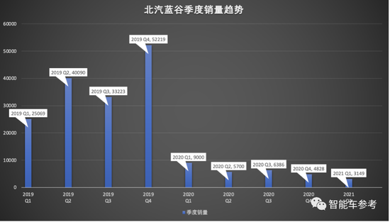 2020年第一季度,北汽蓝谷销量9000辆,环比上季度大跌82.76%。