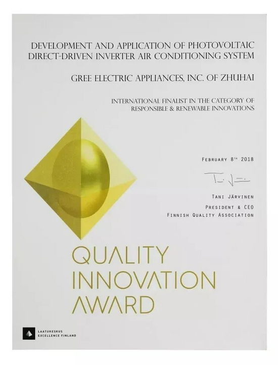 2017年度国际质量创新大赛颁奖(Quality Innovation Award)大会在西班牙毕尔巴鄂举行,格力凭借《光伏直驱变频空调系统研发及应用》项目荣获国际质量创新大奖,成国内家电行业唯一获得该奖项的企业。