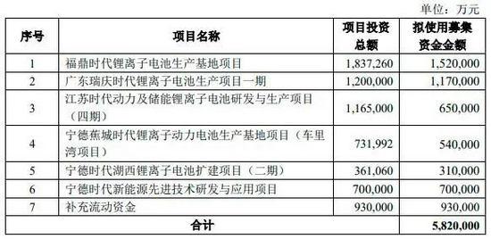 宁德时代本次发行拟募集不超过582亿元。用于福鼎时代锂离子电池生产基地项目、广东瑞庆时代锂离子电池生产项目一期项目、江苏时代动力及储能锂离子电池研发与生产项目(四期)项目、宁德蕉城时代锂离子动力电池生产基地项目(车里湾项目)项目、宁德时代湖西锂离子电池扩建项目(二期)项目、宁德时代新能源先进技术研发与应用项目;并补充流动资金93亿元。