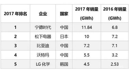 2017年,宁德时代的动力电池出货量增长73%,达到11.8GWh,一举越过松下,拿下行业全球第一位置。自那以后,宁德时代就一直是全球动力电池市场的领导者。宁德时代2017年占据了中国市场的三成份额,在中国生产的三辆新能源车型中,就有一辆搭载了宁德时代动力电池组。