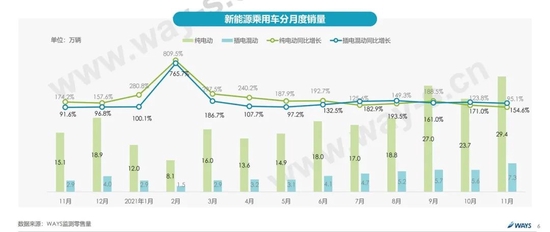 11月,纯电动销量约29.4万辆,同比增加95.1%,环比下降24.0%;插电混动销量约7.3万辆,同比增加154.6%,环比下降30.6%。