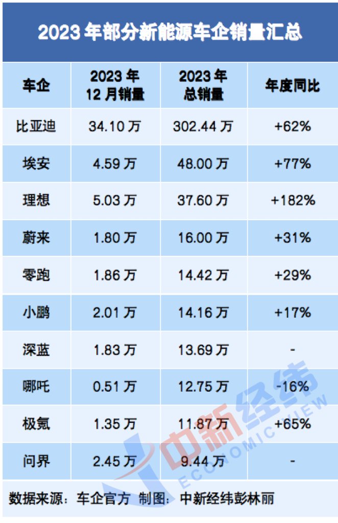 近日,中国多家新能源车企公布了2023年12月以及2023年全年的交付数据。