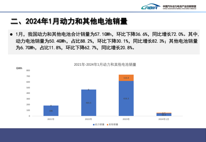 中国汽车动力电池产业创新联盟日前发布的数据显示,1月,我国动力和其他电池(主要指储能电池)合计产量为65.2GWh,环比下降16.1%,同比增长68.0%。动力和其他电池合计销量为57.1GWh,环比下降36.6%,同比增长72.0%。其中,动力电池销量为50.4GWh,占比88.2%,环比下降30.1%,同比增长82.3%;其他电池销量为6.7GWh,占比11.8%,环比下降62.7%,同比增长20.8%。