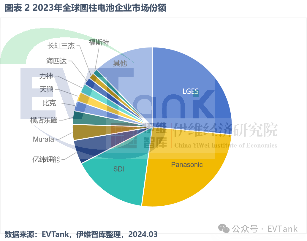 从2023年主要圆柱企业竞争格局来看,行业集中度进一步提升,其中前三家韩国LGES、日本松下和韩国SDI合计市占率提升10.1%,国内亿纬锂能和横店东磁市占率分别提升0.1%和1.2%,其余均呈现不同程度下滑。