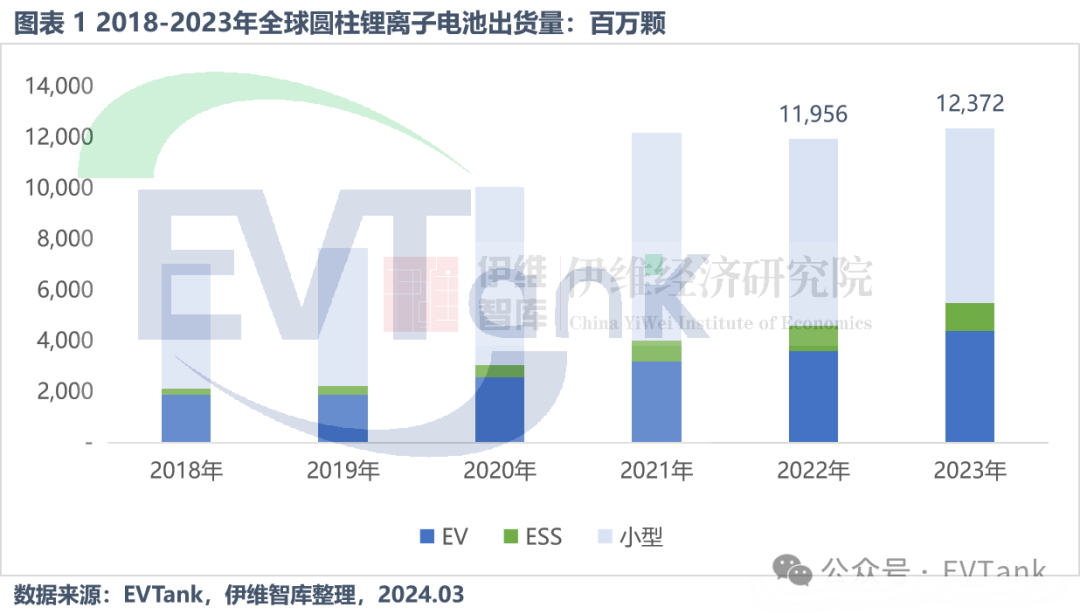 近日,研究机构EVTank联合伊维经济研究院共同发布了《中国圆柱锂离子电池行业发展白皮书(2024年)》。白皮书数据显示,2023年,全球圆柱锂离子电池出货量同比微增3.5%至123.7亿颗。
