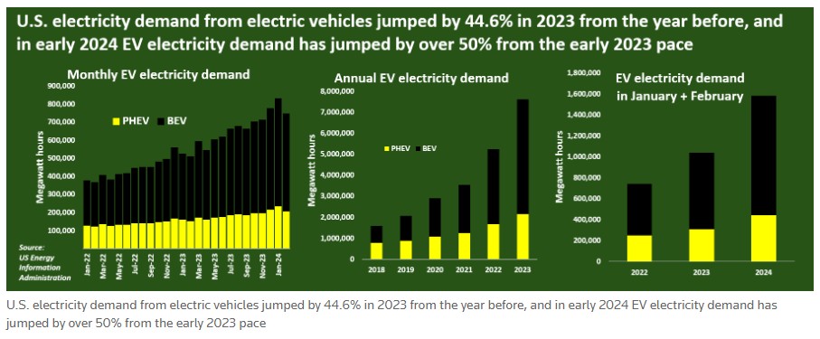 根据美国能源信息署(EIA)的数据,截至2024年2月,电动汽车的总用电量为158万MWh,相比之下,2023年同期为104万MWh,52%的增速也超过了2023年同期40%的增长率,这表明电动汽车销量的快速增长对电力市场的影响继续增加。