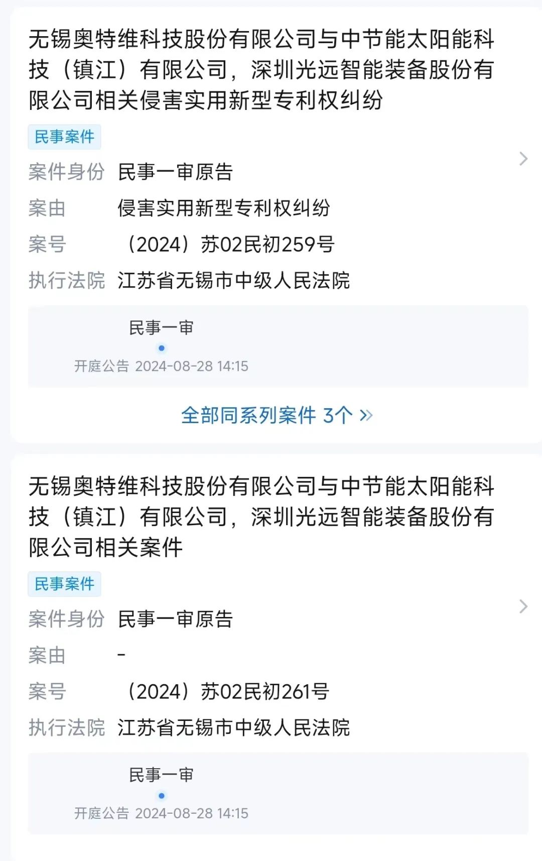 (1)光伏设备企业奥特维向无锡市中级人民法院起诉中节能太阳能科技(镇江)有限公司、深圳光远智能装备股份有限公司,侵害其实用新型专利权。