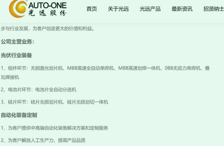 公司官网介绍,其业务范围涵盖硅片、电池片、组件三大环节,核心产品为无损激光划片机、多主栅高速串焊机、无主栅互联设备。