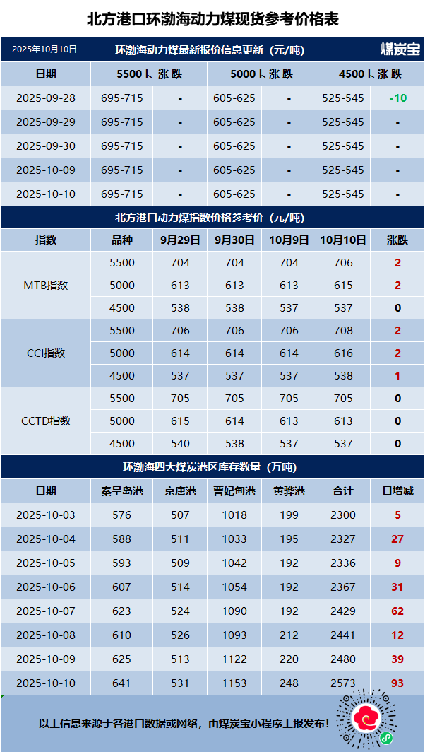 10月10日,煤炭市场的行情走势太魔幻了!去煤矿跑产地的老乡说,路上拉煤的货车稀稀拉拉,寥寥无几。今天陕蒙地区煤矿依旧是有涨有跌,国庆节后比平时还是少了一大半。可是港口那边,这就按捺不住了,环渤海动力煤指数反倒悄悄涨起来了 ——北方港指数全部上涨2元,5500K指数都摸到706元 / 吨了,这反差看得人一头雾水。