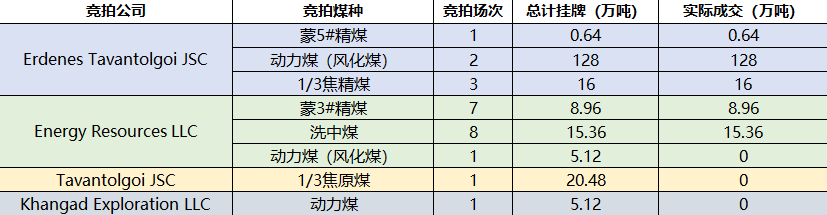 此外,Erdenes Tavantolgoi JSC公司还挂牌了0.64万吨蒙5#精煤,起拍价为163.6美元/吨,最终以165.6美元/吨成交,溢价2美元/吨。值得关注的是,该批煤炭的交付地点为我国曹妃甸港口,标志着蒙煤销售首次采用我国港口交付的新模式。该公司还挂牌了2场动力煤,合计128万吨,交付日期为2026年7月1日,起拍价分别为40.8美元/吨和44.5美元/吨,成交价分别为40.8美元/吨和48.4美元/吨。
