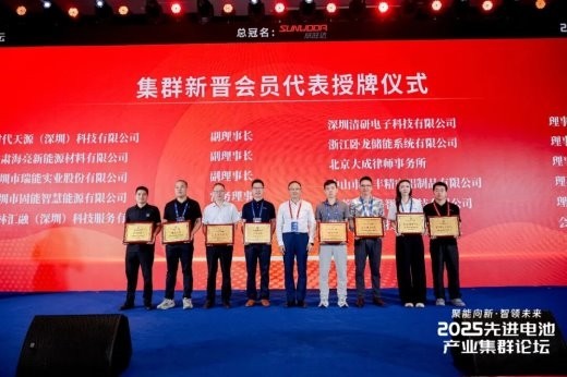 现场还举行了新晋集群会员代表授牌仪式。时代天源(深圳)科技有限公司、甘肃海亮新能源材料有限公司、深圳市瑞能实业股份有限公司、深圳市固能智慧能源有限公司、汉林汇融(深圳)科技服务有限公司等11家新晋会员企业代表上台荣膺授牌。