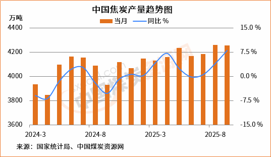 1-9月份累计,全国焦炭产量37716万吨,同比增3.5%。其中山西焦炭产量7651.9万吨,同比增长12.7%;占比20.3%。