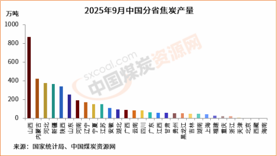分省份产量数据显示,9月份,焦炭产量排名前五的省区由高到低排是山西、内蒙古、河北、新疆和陕西。其中,山西焦炭产量是排名第二位内蒙古的2.1倍。