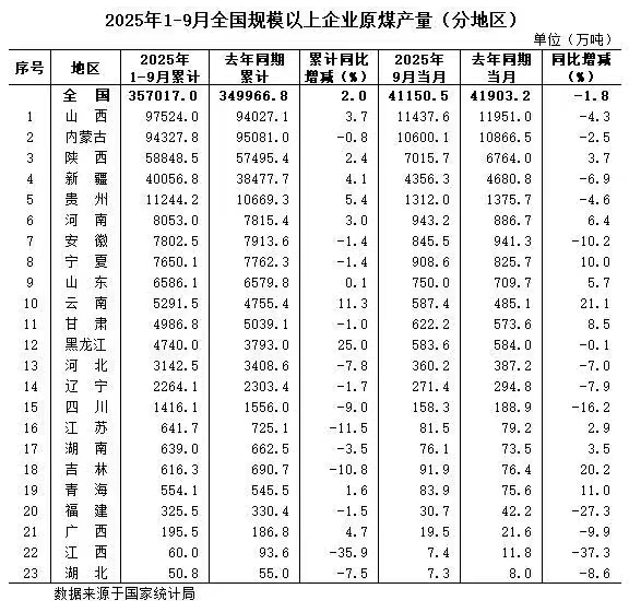 2025年1-9月份全国规模以上分省区原煤产量数据发布