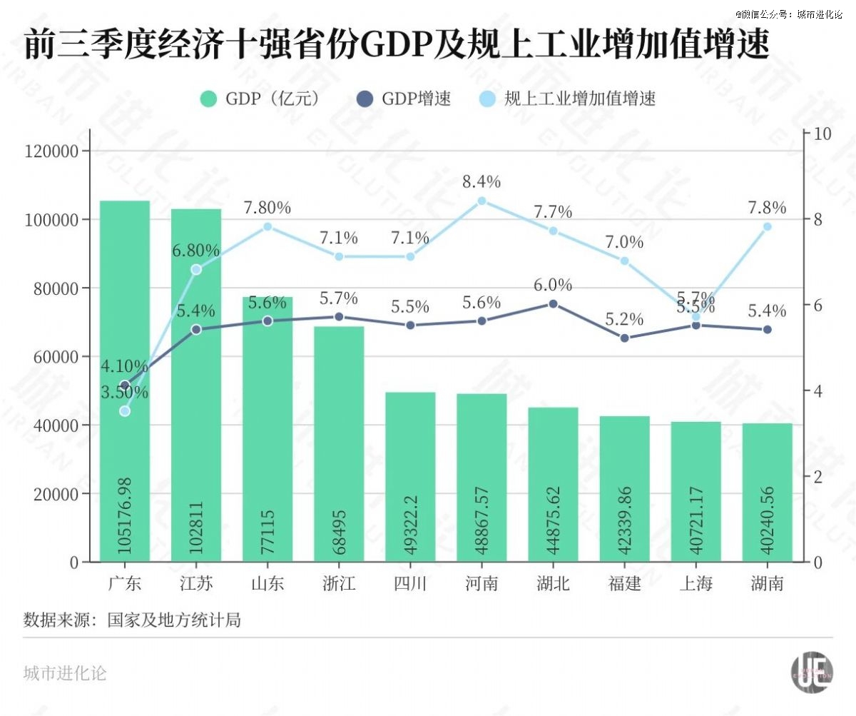 中国城市经济学会副会长、长江经济带高质量发展智库联盟秘书长秦尊文接受城市进化论采访时表示,“相比粤苏,山东传统产业占比较高,制约产业发展。湖南此前经济增速也一度低于全国平均水平。两个省份都需要继续加强数智化转型,推动产业进一步升级。”