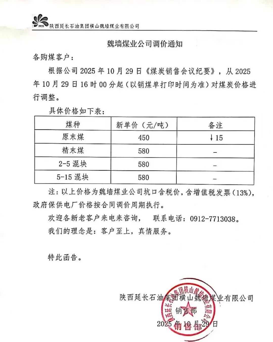 横山魏墙煤矿10月29日原末煤再降15元通知