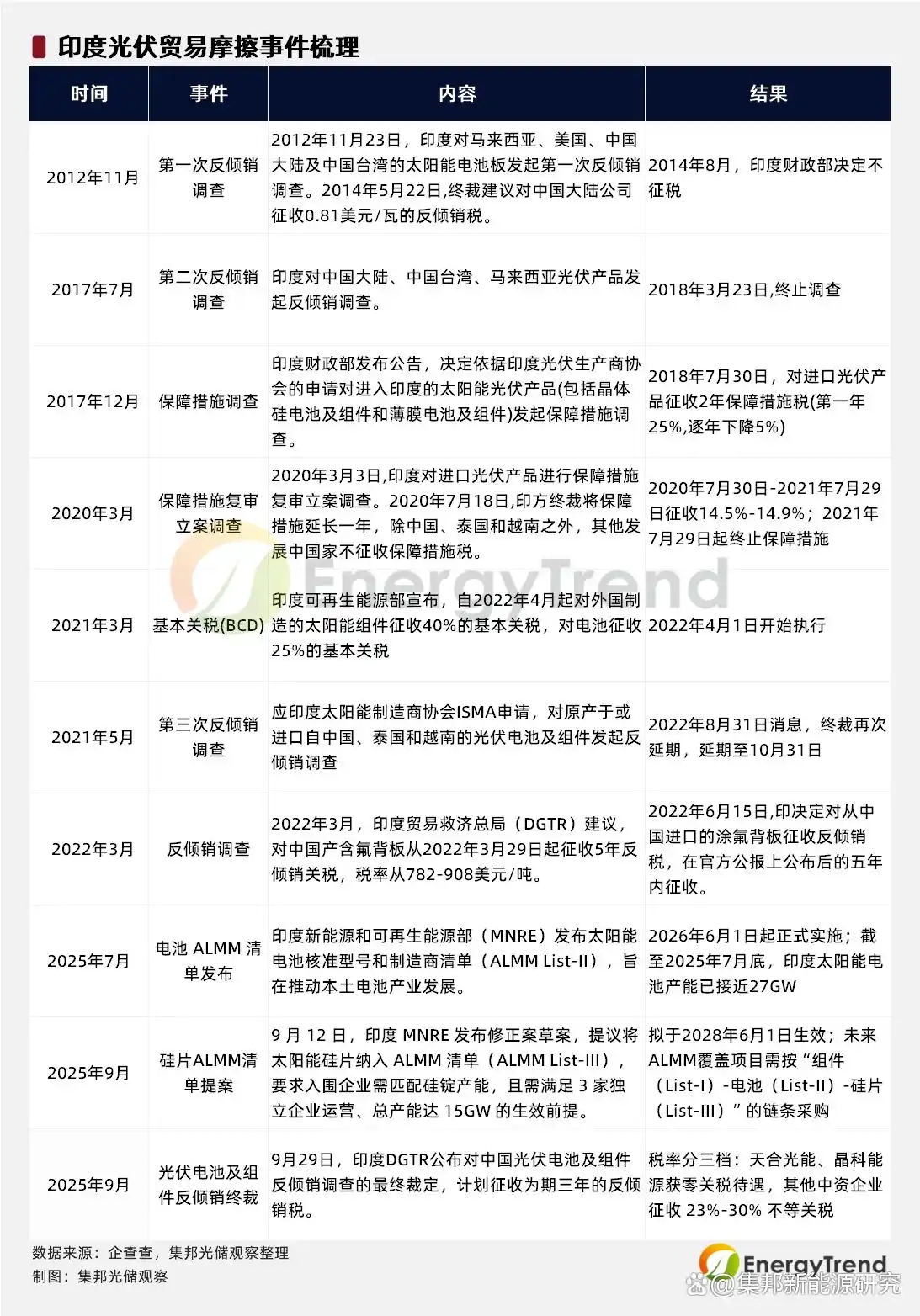 印度的贸易政策收紧趋势显著,从早期反倾销税到2024年生效的ALMM清单,再到2025年9月终裁的3年反倾销税政策,印度对华光伏产品的贸易保护壁垒持续升级,其核心诉求清晰明确。