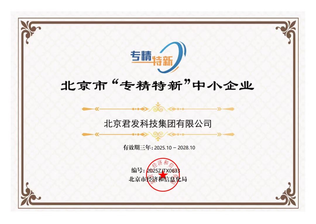此前,北京君发科技集团有限公司已通过科技型中小企业、创新型中小企业和ISO质量环境安全管理体系认证,建立起全面的质量管理体系。“专精特新”资质的获得,使君发科技在政策支持、资金补贴、市场拓展等方面将享有更多优势,为企业的技术推广和产业化发展注入新动力。
