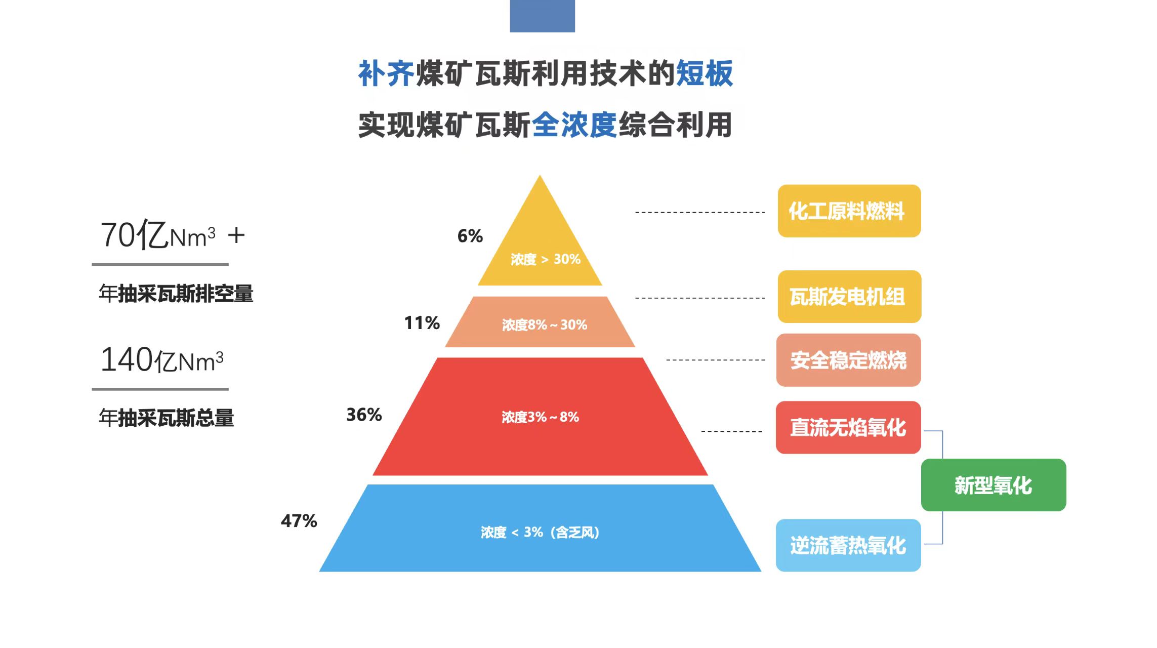 企业开创性研发了煤矿低浓度瓦斯本质安全“稳定燃烧”、“直流无焰氧化”、“新型(复合)氧化、逆流蓄热氧化技术(RTO)”等技术并工业化应用成功,这些成熟创新技术与传统技术的耦合搭配可实现煤矿瓦斯全浓度利用。