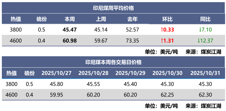 截至上周五,印尼煤3800卡报价为FOB45.3美元/吨,比上周略回调了0.2美元/吨;4600卡报价为FOB62.3美元/吨,比上周上调了2.35美元/吨。本周印尼低卡煤报价维稳,中卡煤因供应紧张加需求端询货良好,报价继续上涨。本周我国内贸煤价高位震荡下,而进口印尼煤价格优势明显,华南电厂对印尼低卡煤采购意愿提升。
