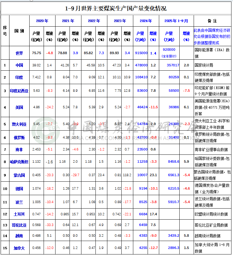 2025年前三季度世界主要煤炭生产国产量变化情况