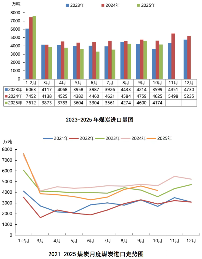 根据国家海关总署公布的最新数据显示,2025年10月份,我国进口煤炭4173.7万吨,较去年同期的4624.8万吨减少451.1万吨,降幅为9.8%;较9月份的4600.3万吨减少426.6万吨,降幅为9.3%。2025年1-10月份,全国共进口煤炭38762.3万吨,同比下降11%。从单月数据来看,10月进口量结束了自7月以来连续三月环比增加的态势。