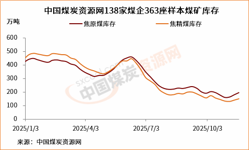 需求的转弱也促使煤矿库存开始有所累积。中国煤炭资源网产销存连续追踪数据显示,截至11月19日,本周363座样本煤矿焦原煤库存周环比增加8.9%至196万吨,连续第三周增长;精煤库存周环比增加7.2%至150万吨,连续第二周增长。