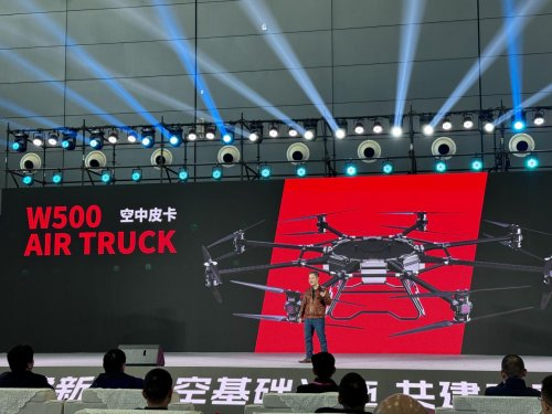 与IMU的精致体积形成鲜明对比的,是发布会现场揭幕的“庞然大物”——ZX-W500大载重物流无人机。这款无人机是志翔科技自2018年起前瞻性布局低空物流的结晶,实现了续航、载重、环境适应性三大核心突破。ZX-W500纯电动无人机有效载重高达400公斤,飞行时间显著提升,并能适应高原、高温、高寒等极端环境,具备强大的抗风能力。