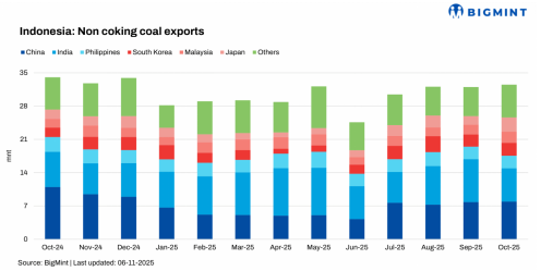 据BigMint 11月6日发布的信息,2025年10月,印度尼西亚动力煤(Non-coking coal,非焦煤)出口出现温和回升,较9月份的3199万吨增长1.6%,达到3251万吨。但与去年同期相比,出口发货量仍下降了4.6%。