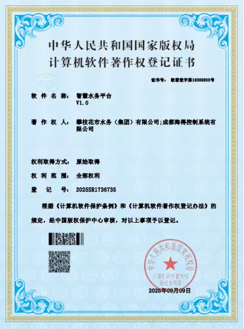 近日,市环境能源集团旗下攀枝花市水务(集团)有限公司与成都海得控制系统有限公司联合研发的应用软件《智慧水务平台》(V1.0)顺利通过国家版权局审查,获国家计算机软件著作权。这是集团首次获得国家级软件领域知识产权,标志着企业在智慧水务技术研发与数字化转型道路上实现了重要突破。