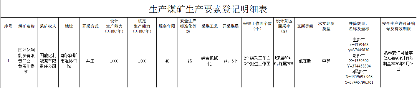 国能亿利能源有限责任公司黄玉川煤矿为产能核增煤矿,核定生产能力1300万吨/年(原生产能力1000万吨/年),该矿已完成化解过剩产能任务并取得1300万吨/年环境影响报告书批复。按照《国家能源局关于完善煤矿产能登记公告制度开展建设煤矿产能公告工作的通知》(国能发煤炭〔2017〕17号)、《生态环境部 国家发展改革委 国家能源局关于进一步加强煤炭资源开发环境影响评价管理的通知》(环环评〔2020〕63号)等文件要求,现对该矿生产能力等相关要素信息予以公告。