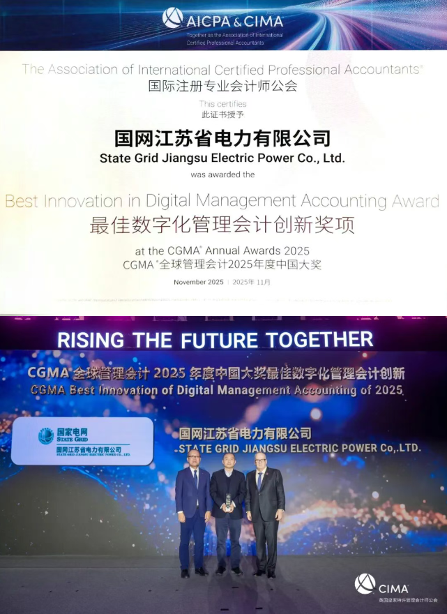 11月26日,由CIMA 英国皇家特许管理会计师公会主办的CGMA全球管理会计2025年度中国大奖暨CFO高峰论坛在上海举行。大会现场揭晓了CGMA全球管理会计2025年度中国大奖榜单,中国电气装备集团有限公司(以下简称:中国电气装备)与国网江苏省电力有限公司(以下简称:国网江苏电力),凭借在数字化管理会计与财务共享服务中心建设方面的卓越成果,分别荣获“最佳财务共享服务中心”与“最佳数字化管理会计创新”奖。