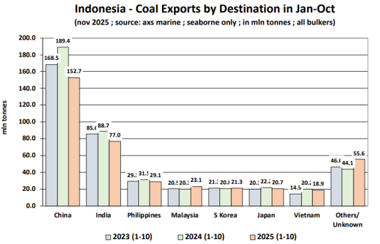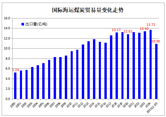 据船舶经纪与服务集团班切罗・科斯塔(Banchero Costa)最新发布的市场周报(MARKET REPORT – WEEK 47/2025),其援引AXS Marine船舶运输跟踪数据显示,2025年1-10月,国际海运煤炭船舶载运量(不包括各国国内沿海货物运输)累计为10.895亿吨,比去年同期下降3.6%。