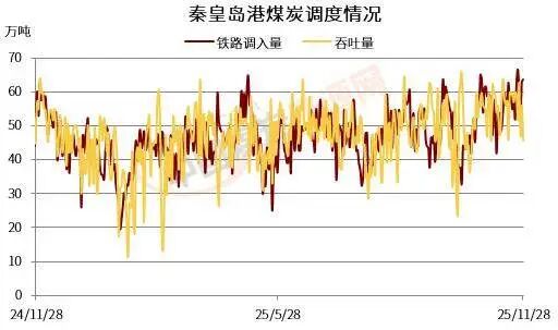 随着气温的逐渐下降,长协供应保障度有所提升,促使产地供应跟随增加,大秦线运量在周内维持在130-131万吨的高位,较上周略有增加,带动秦皇岛港调入量延续增长态势。