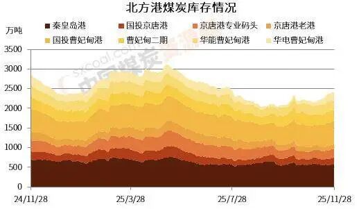 北方港整体库存保持增长态势,不过本周累积有所放缓。截至11月28日,北方港(秦皇岛港、国投京唐港、京唐港老港、京唐港专业码头、国投曹妃甸港、曹妃甸二期、华能曹妃甸港、华电曹妃甸港)总库存量为2420万吨,较上周同期增加49万吨,较上月同期增加213万吨,较去年同期减少372.7万吨。