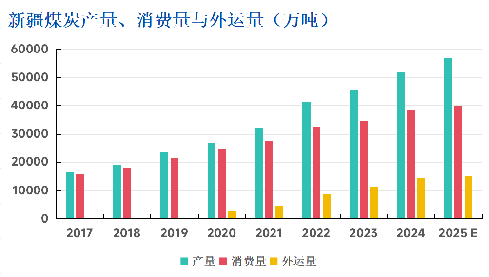 截至目前,中国铁路乌鲁木齐局集团有限公司已完成8518.01万吨的疆煤外运量,同比增长6.4%。而新疆丰富的煤炭资源为外运提供了强大支撑。新疆的煤炭资源量居全国首位,特别是埋深2000米以内的煤炭资源量占全国40%,探明资源量达到4381亿吨,占全国四分之一。2024年新疆煤炭产量达到5.41亿吨,较2020年增长了85%。在此背景下,“疆煤外运“已成为保障国家能源安全、优化全国能源配置的关键战略。