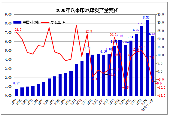 据印尼IDX 频道、Bloombergtechnoz、Dunia-energi等媒体11月27日发布的消息,印度尼西亚煤炭矿业协会(Asosiasi Pertambangan Batu Bara Indonesia - APBI)透露,截至2025年10月末,印度尼西亚的煤炭产量累计达6.61亿吨,并预计全年煤炭产量可能在7.4亿吨左右,较2024年实际产量8.36亿吨显著减少近1亿吨。