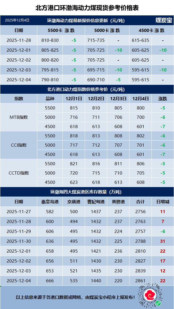 12月4日北方港动力煤价格指数与库存统计